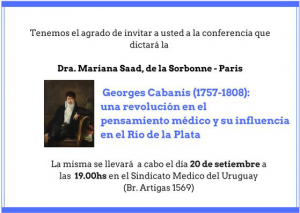 El pasado jueves 20 de setiembre de 2018, en el Sindicato Médico del Uruguay, se llevó a cabo una conferencia dictada por la Dra. Mariana Saad, compatriota, radicada en Francia, docente en la Universidad de París, La Sorbone, y que trató sobre la figura del médico y filósofo francés Pierre Jean Georges Cabanis.